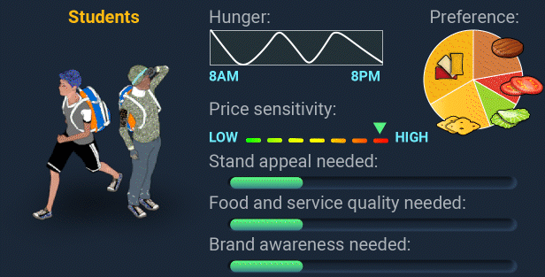 🍔 Customisable Burgers – Craft the Perfect Recipe: Master the art of burger creation by choosing the right ingredients to delight each customer segment. Every demographic has a preferred flavour combination, and discovering the perfect burger recipe for each group is the secret to skyrocketing your food truck’s popularity!