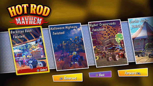 Feel the chill on Snow Summit, charge through Cyber City, or celebrate on the Mariachi Mile! Each track offers forward, mirrored, reversed, and twisted modes for added chaos!
