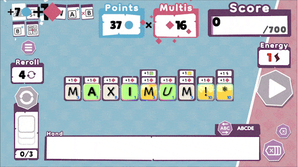 Choose your words, special letters, and bonuses wisely to rack up combos, score big, and level up! But watch out, you’ve only got a limited number of tries to hit the target score. Need help? Reroll your letters and hope for a better hand!