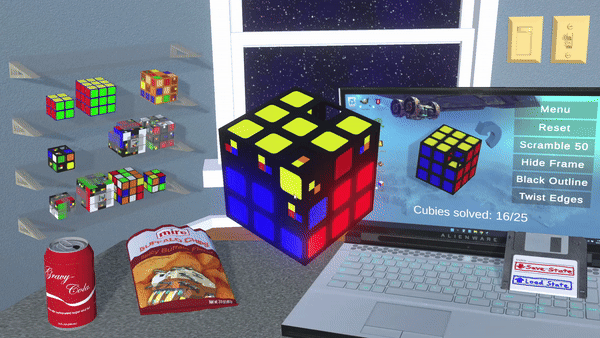 Curate your cube collection! When you solve a cube, it appears as unscrambled on your shelf, and a new bonus cube may be unlocked. Mouse wheel over a cube to rotate it horizontally, or right click to match its angle to the cube in play. Click and drag to swap cubes around. You can even drag a display cube to the cube in play to instantly switch puzzles!