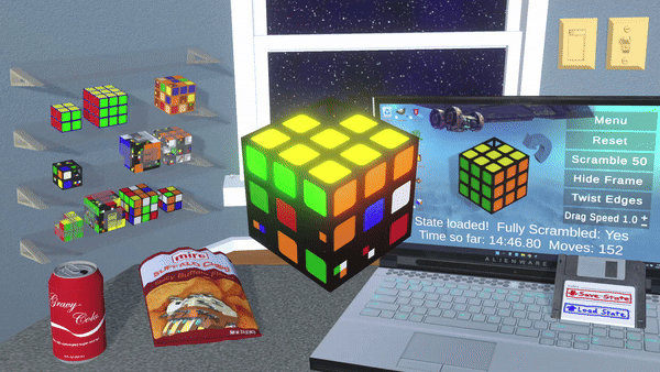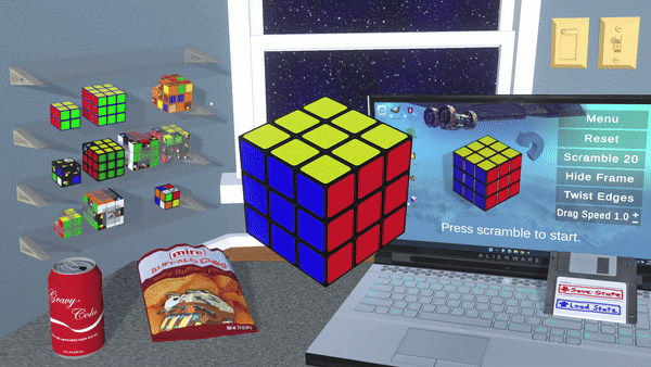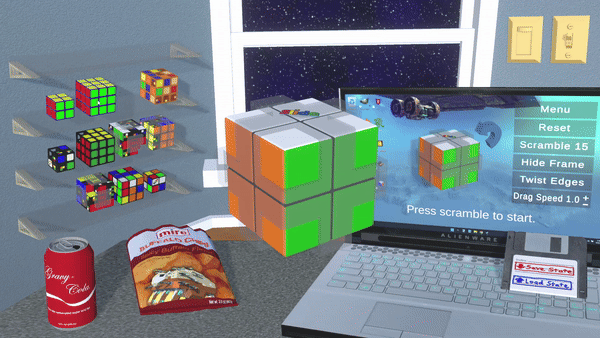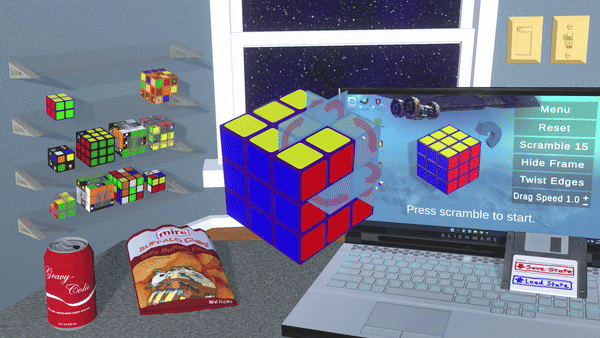 To start, select a puzzle cube from the menu or shelf, as shown in the trailer. From there, you can press scramble to begin a timed solve, or play around with moves starting from the solved state. This is useful for practicing and experimenting with algorithms.