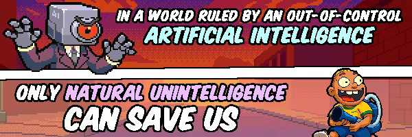 A rogue AI threatens the world. Your weapons? Pizza, pranks, and pure stupidity. Desinteligência Natural blends roguelike robot fights, goofy deliveries, and NPC trolling into one big, dumb, hilarious adventure. Embrace the chaos!