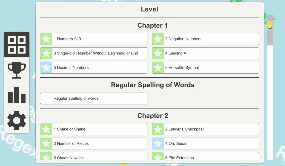 30+ Meticulously Designed Levels covering fundamental Regex concepts through: