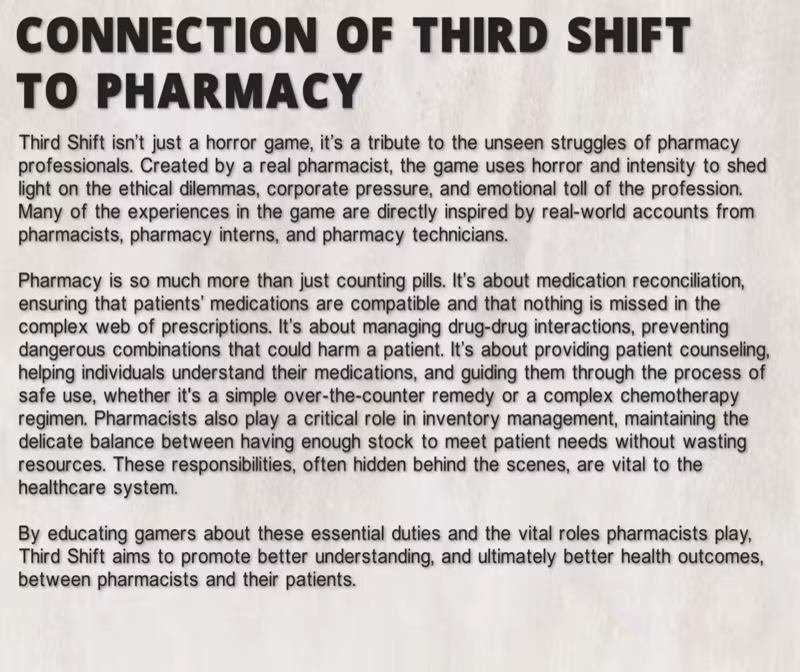 Third Shift is a first-of-its-kind survival horror game set in the eerie, high-stakes world of a late-night pharmacy. You play as a pharmacist under extreme pressure, not just from managing dangerous drug interactions and corporate metrics, but from confronting terrifying supernatural threats that unfold with every shift. Combining point-and-click mechanics with sit-and-survive gameplay, Third Shift blends fast-paced reflexes, immersive storytelling, and chilling psychological tension in a setting that’s never been explored in horror gaming.