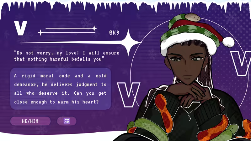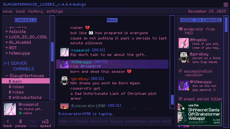 In this festive addition to the dark satire romance chatsim Killer Chat! series, journey through the server’s past, present & future to learn more about our serials and find the true meaning of Christmas. What's the worst that could happen?