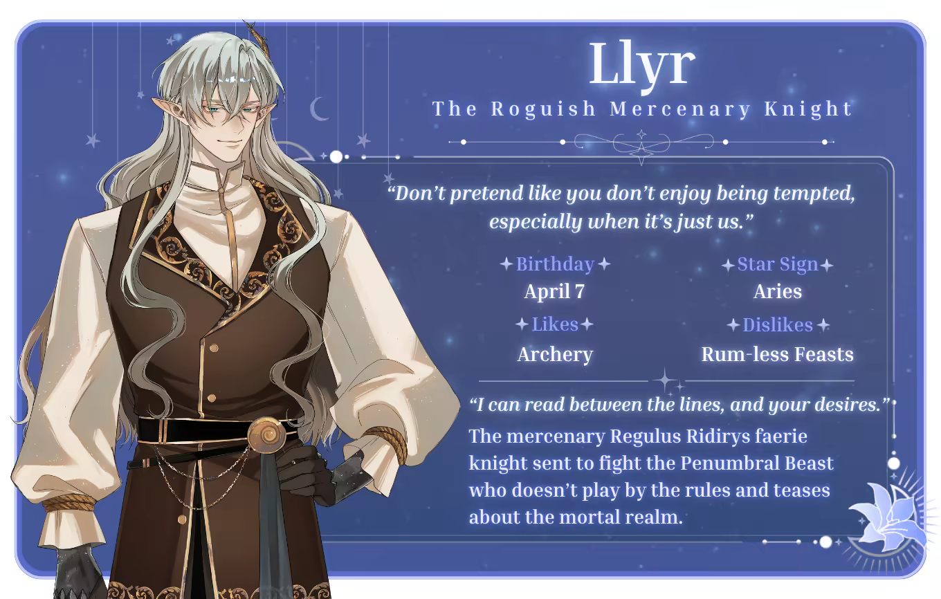 Frequently reminded about how she was rescued by faeries despite being a human, Lilika (renamable MC) has lived all her life repaying the faeries with her servitude — to cook, clean, and care for the heirs of an elite faerie family in the realm. When the family receives their annual invitation to an upcoming masquerade held by the High Court, Lilika is surprised to also receive an invitation letter, only to have her dreams crushed by the family’s objections.