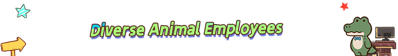 The game features a wide variety of adorable animals (only a few designs are shown here), each with unique appearances, colors, and outfits. Can you recognize all your employees?