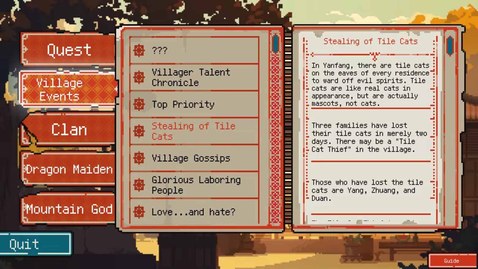 You need to make your plans wisely. Whether to continue investigating the main quest, or to help others repair the swing and find the stolen tile cats? Or maybe these “side quests” also contain key clues?