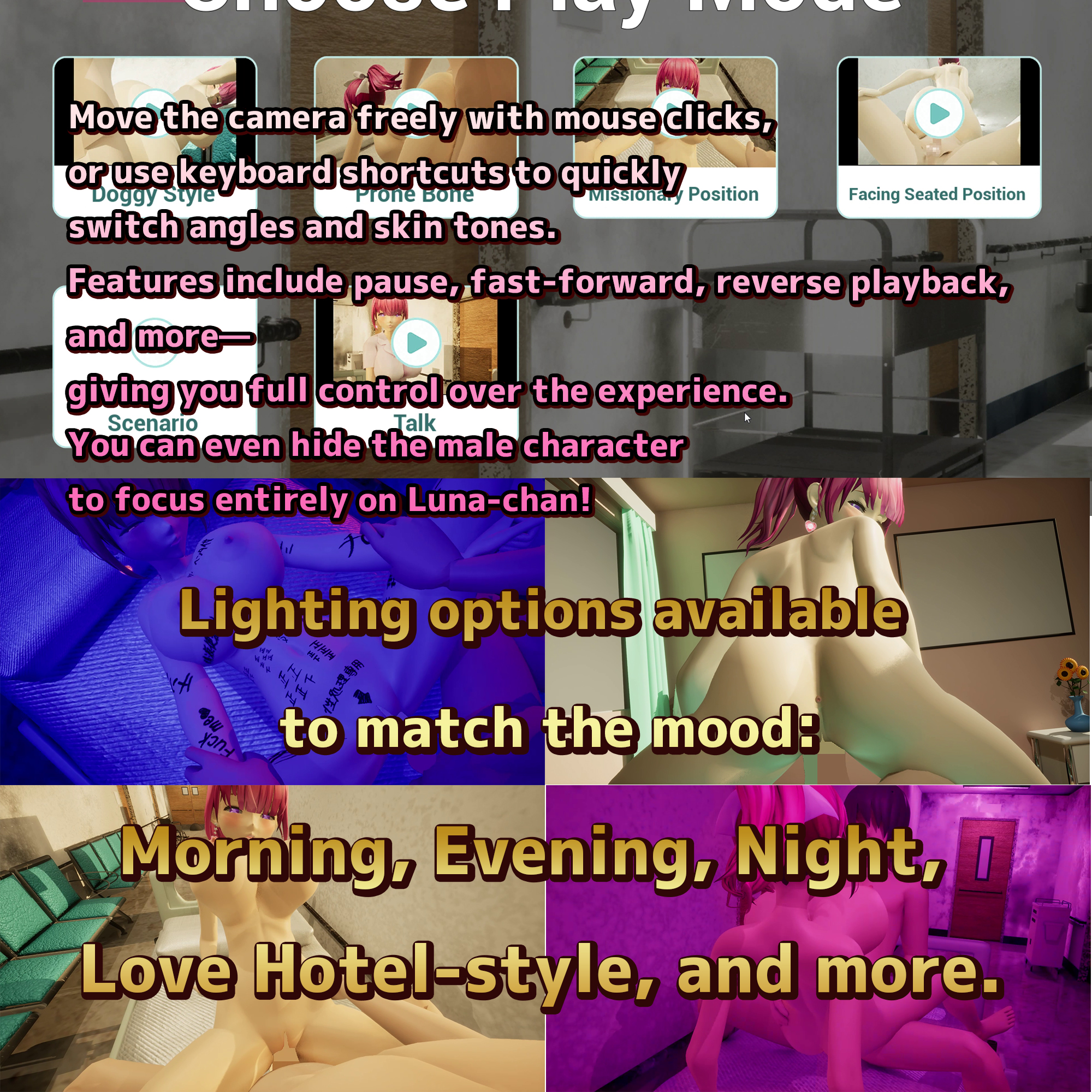 Includes various customization options such as love hotel-style lighting, skin tone adjustments, and male character invisibility.