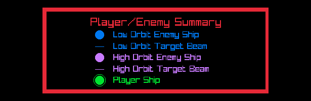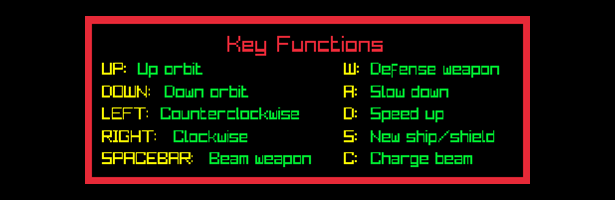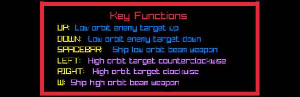 Play until the Player Ship is destroyed. Use the Player Ship beam weapons to discharge the Low and High Orbit Enemy ships before they fire their weapon. Firing on a noncharging enemy ship will result in a feedback beam pulse that will reduce your score. The enemy weapons will charge faster and faster over time as the bonus round continues. Player initials, high score, Enemy Low and High Orbit Charge Speed (CSL) and CSH) for the bonus round is saved.