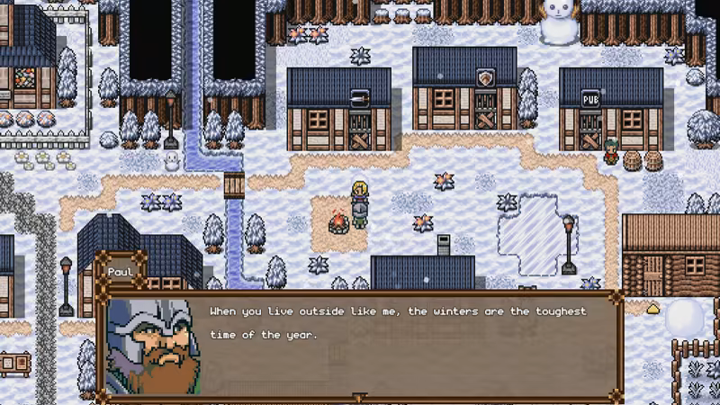 Our Town Hero is a retro RPG that could be described as cozy. It's being designed to evoke a nostalgic feeling, with graphics and music that would fit on a Game Boy Color or SNES. But with modern touches and up-to-date gameplay. One of the central themes of the game is the changing seasons. Winter, Spring, Summer, and Fall will bring some new weather, decor, and life to your town. The game begins in winter, with your town mostly quiet. Times are bleak. The businesses are closed due to the kidnappings. But by the end, you will hopefully have a thriving and bustling town by years end. You will be the reason this town comes alive once more.