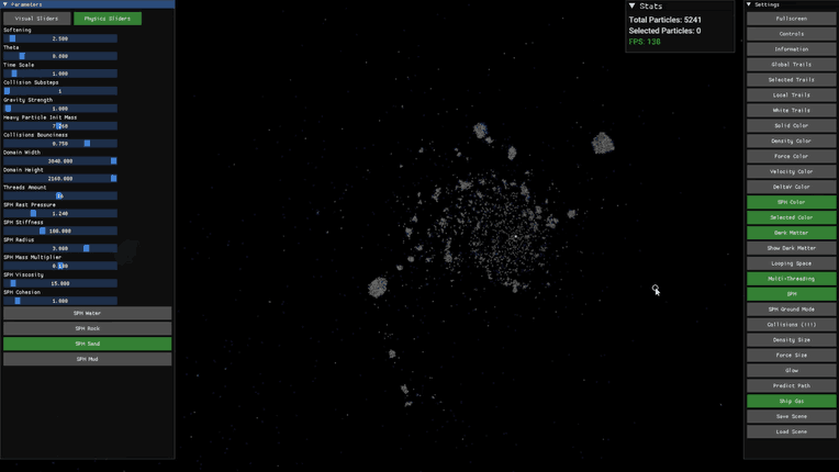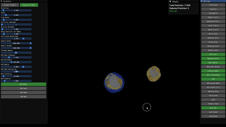 Play with planetary formations and collisions thanks to Smoothed Particle Hydrodynamics (SPH) fluids.