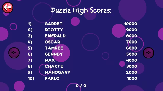 What fun would arcade game be without keeping score? Upon game over, you'll be asked to enter your name to be placed on the leaderboard. Each mode has its own table (except Chill, of course.)