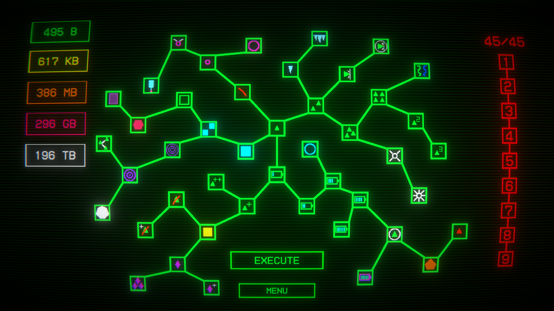 Spend bytes to unlock over 40 upgrades and discover new mechanics.