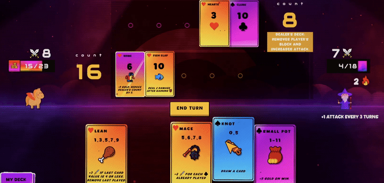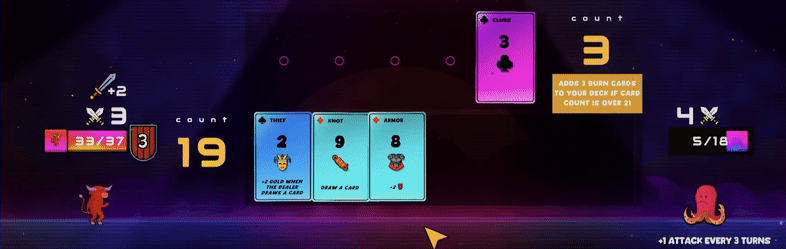 Twist the rules of blackjack by playing custom cards from your hand. Each card in your hand shows a range of possible values (like 1–5). When played, its true value is revealed and added to your total. Get as close to 21 as possible without going over. Win the hand and deal some damage!