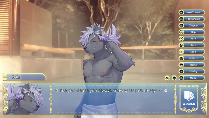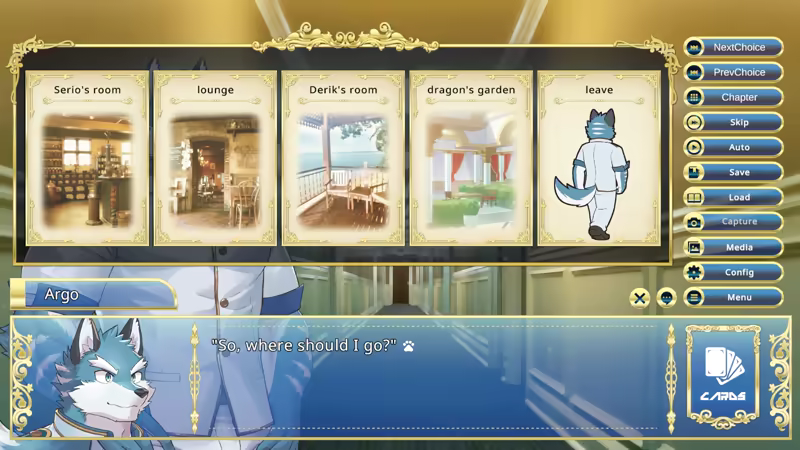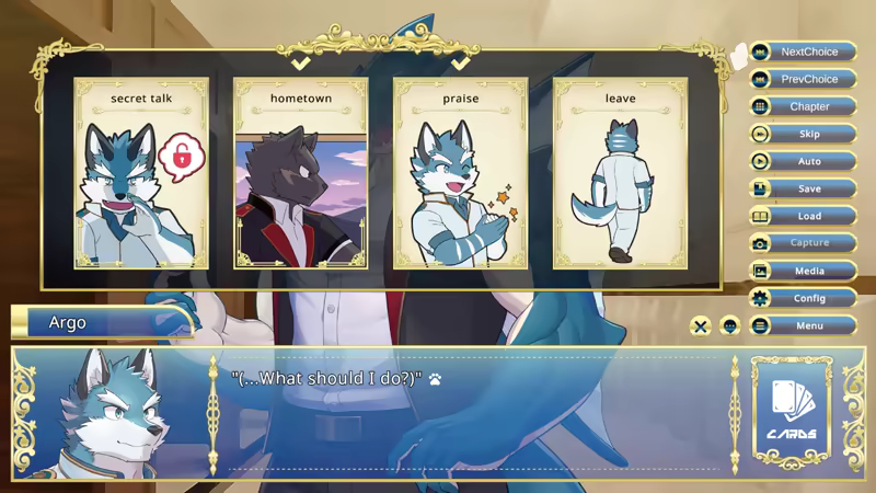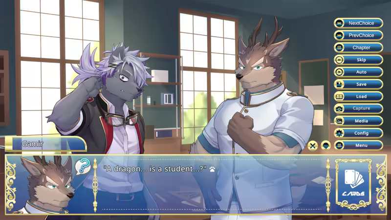 KnightsCollege 2 is a kemono visual novel set in the Knight College, where elite knight candidates live. In this game, every choice is presented as a card, and the protagonist lives in the dormitory while collecting cards.