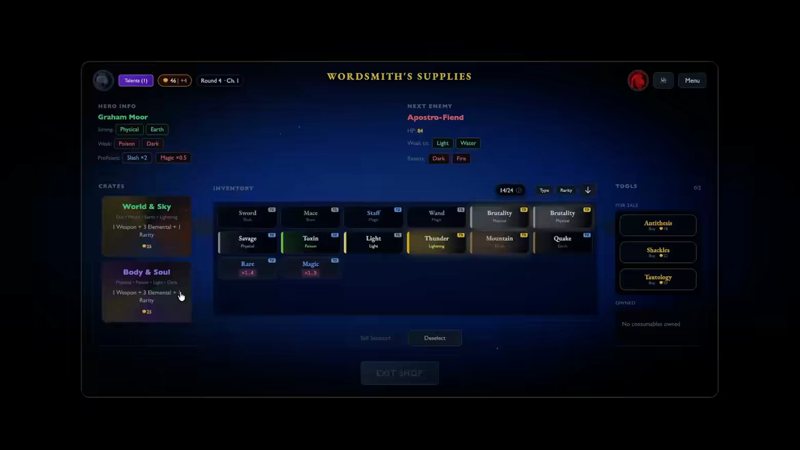 Buy & sell Words, manage your Supplies, and use Tools to perfect your Wordcraft.