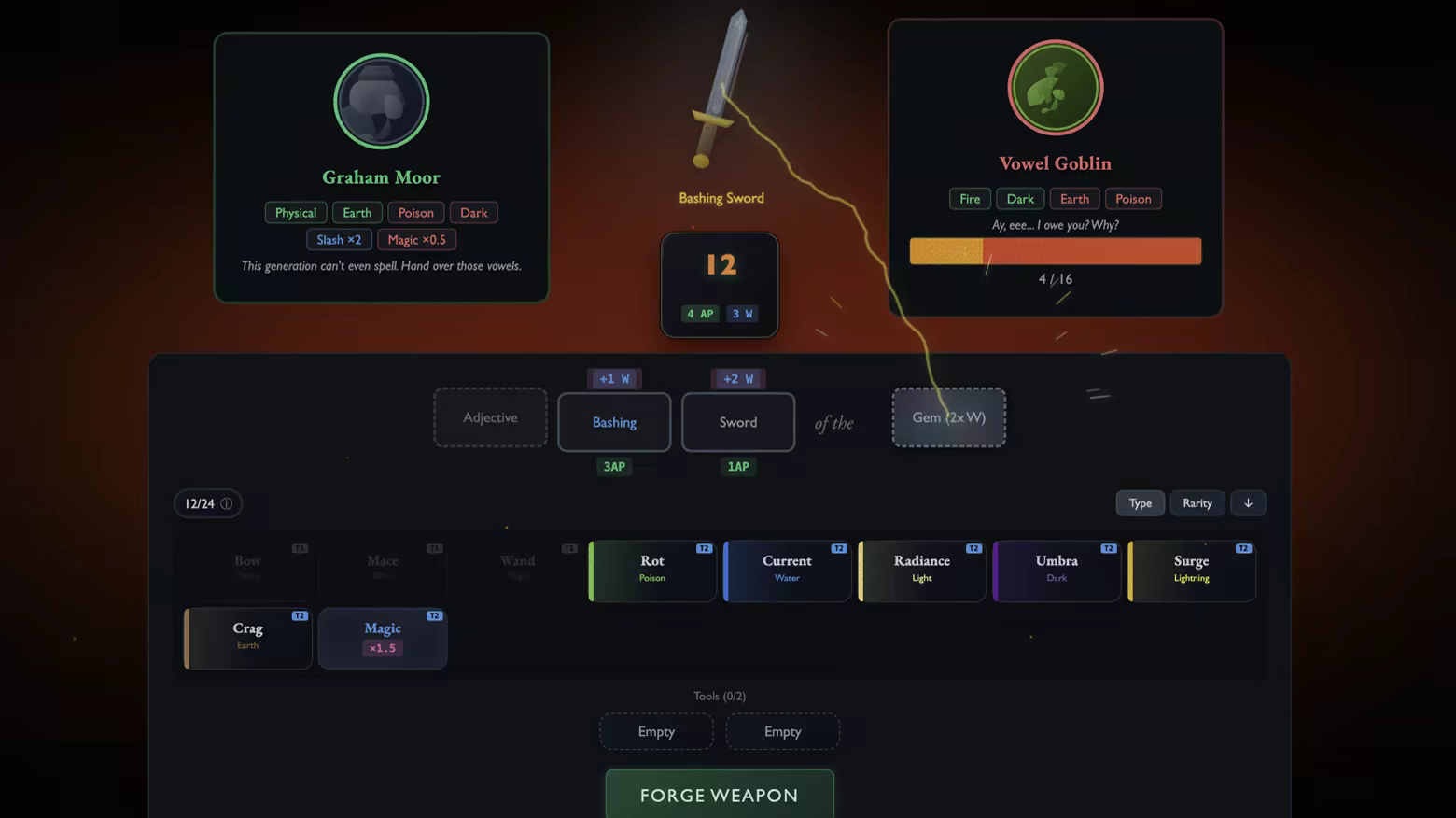 Madlibs meet roguelite! Use Words to fill in the blanks & forge a Wordy Weapon to defeat the enemies!